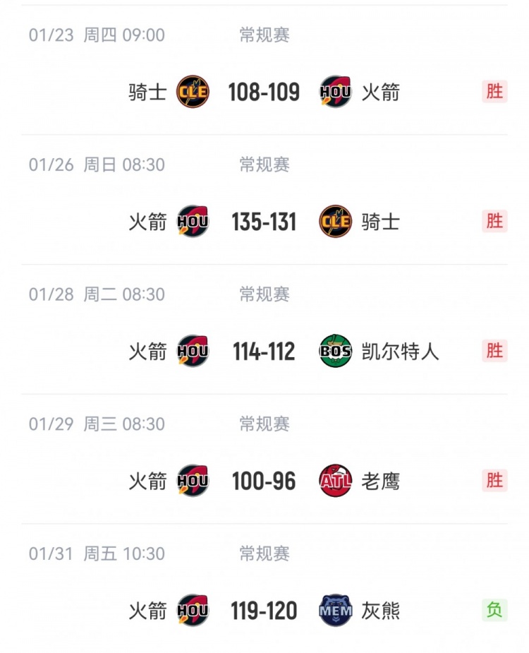 在过去5场比赛中,火箭每场比赛分差都不超过4分,期间火箭4胜1负。