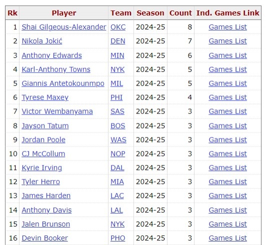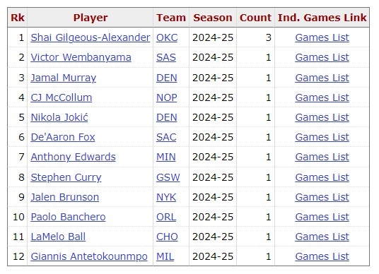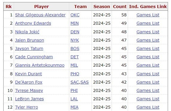 根据数据统计,赛季至今,亚历山大20+、30+、40+、50+场次以及场均得分(32.6分)都是联盟第一。
