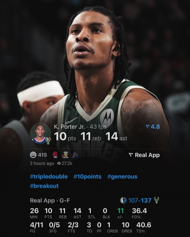 这是小凯文-波特加盟雄鹿后出战的第10场比赛,他也成为队史首位在加盟后前10场比赛中便拿下三双的球员。