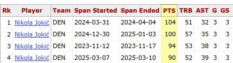 据统计,约基奇在连续3场比赛中至少得到90分50篮板30助攻,自联盟合并以来唯一,而且他生涯已经是第4次做到这一点。