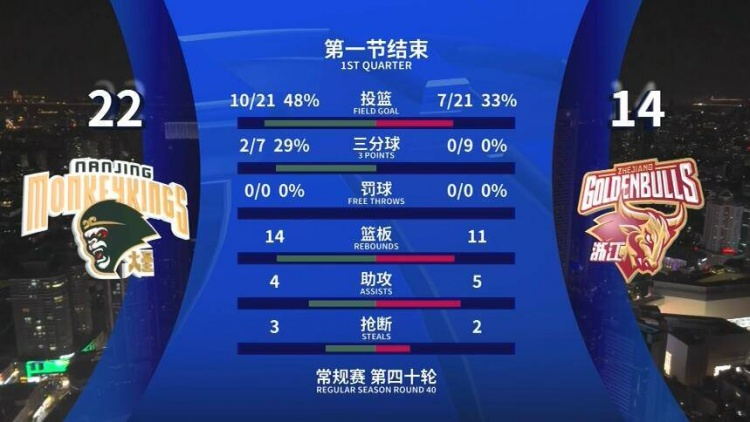 3月14日讯 CBA常规赛,浙江首节14-22落后于同曦。