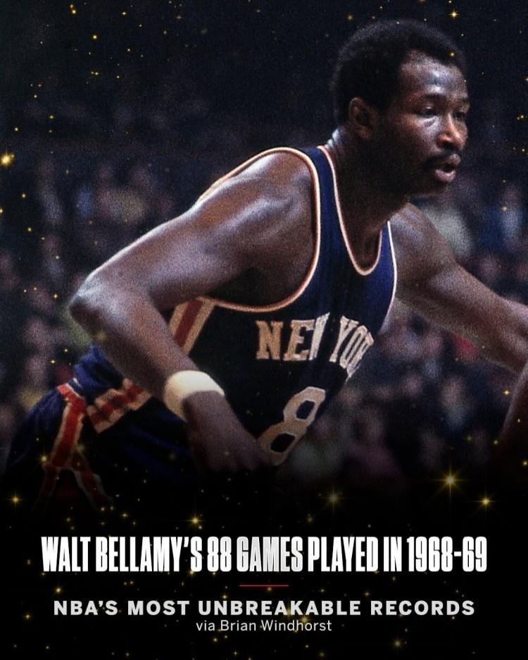 1968-69赛季,沃尔特-贝拉米起初效力于尼克斯,打了35场比赛。随后他被交易到活塞,由于赛程安排的特殊性,他在活塞又打了53场比赛,使他的赛季总出场数达到了88场。NBA历史上共有42次球员单赛季出场数超过82场,最近一次是上赛季的希尔德,效力步行者和76人共计84场比赛。历史上仅次于贝拉米的是汤姆-亨德森,后者在1976-77赛季为子弹队和老鹰共打了87场比赛。