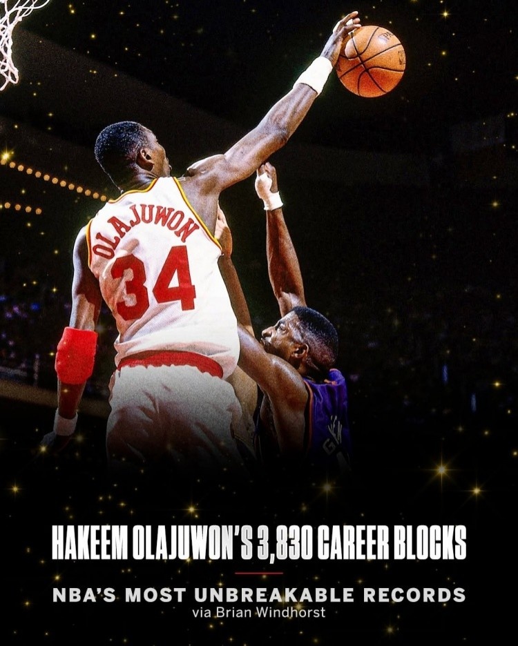 马克-伊顿的单赛季场均5.56次盖帽纪录同样令人望尘莫及,但奥拉朱旺的生涯盖帽总数更是让人感到吃惊。奥拉朱旺比排名第二的穆托姆博多出500多次,而穆托姆博与第九名的差距比与奥拉朱旺的差距更小。有人认为文班亚马有望挑战这一纪录,他的生涯开局确实表现不错。文班亚马在生涯前两个赛季中场均盖帽3.7次,但如果他想超越奥拉朱旺,需要在接下来的13个赛季中保持这一数据且全勤出战。