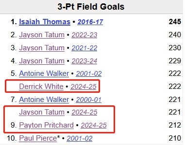 据统计,本赛季凯尔特人有3员大将有望冲击队史单赛季的三分命中数纪录,算上今天的数据,分别为:
