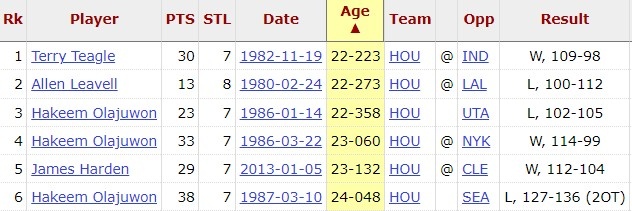 阿门这样一来,阿门(22岁51天)成为了火箭队史上单场送出7+抢断最年轻的球员,此前最年轻纪录是特里-蒂格的22岁223天。