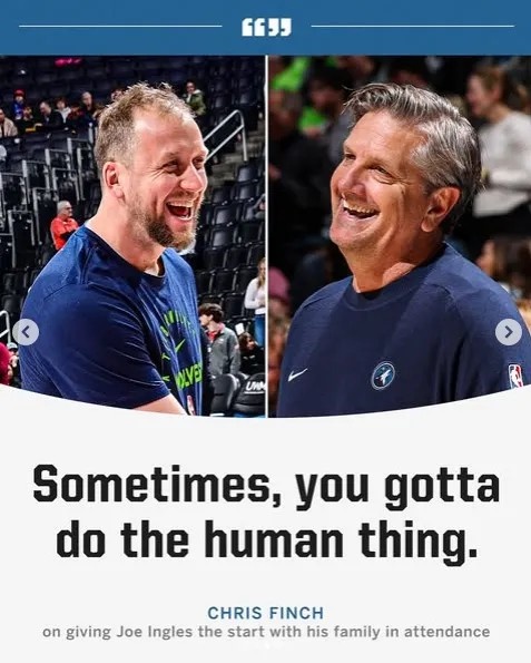 事实上芬奇也是当天早上才决定这样做的。有人跟他说,如果森林狼能够在今晚的比赛中取得大比分领先,在大局已定的情况下让英格尔斯上场会显得很酷,既是对英格尔斯和他儿子的鼓励,也有助于凝聚球队的士气。
