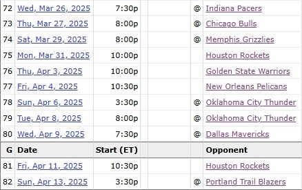 本赛季湖人还有11场常规赛,对手依次是步行者、公牛、灰熊、火箭、勇士、鹈鹕、雷霆、雷霆、独行侠、火箭、开拓者。