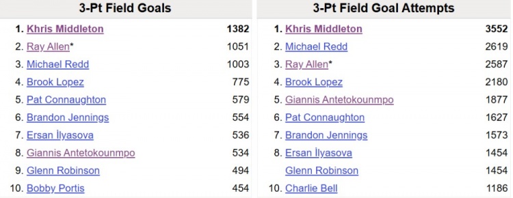 据统计,米德尔顿在雄鹿生涯三分出手3552次,命中1382记,都是队史纪录。