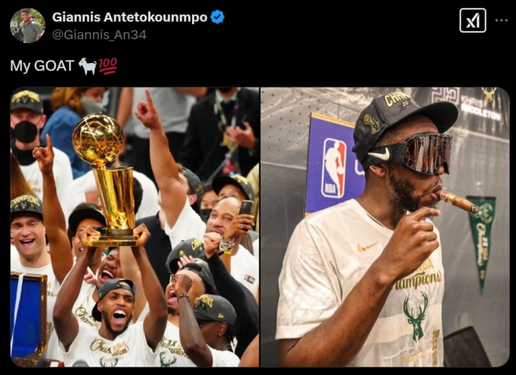 随后,雄鹿球星扬尼斯-阿德托昆博在社交媒体发布动态,晒出了老队友米德尔顿夺冠后的照片(如下图所示),并配文道:“我的GOAT ????????”