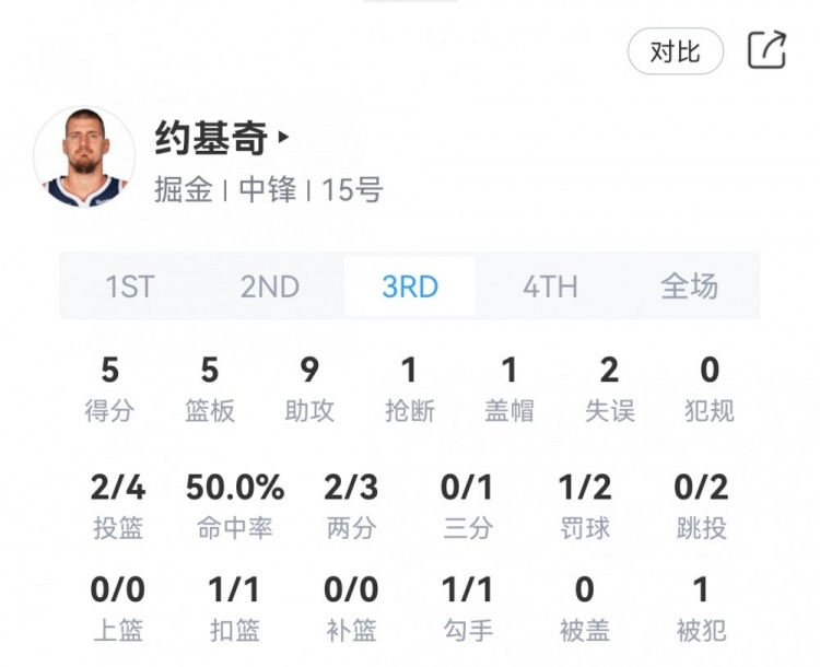第三节,掘金核心约基奇穿针引线,单节送出9次助攻,三节打完约基奇砍下28分10篮板12助攻2抢断。