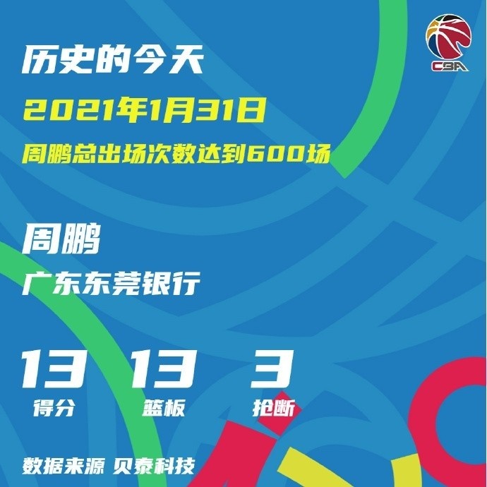 2021年1月31日,CBA联赛常规赛第37轮,广东东莞大益以120-98战胜苏州肯帝亚。这场比赛,周鹏首发出战,全场7投4中,得到13分13篮板3抢断。此役之后,他的总出场次数达到600场里程碑,他也是CBA联赛历史上第六位达到该成就的球员。彼时,他的年龄为31岁113天。