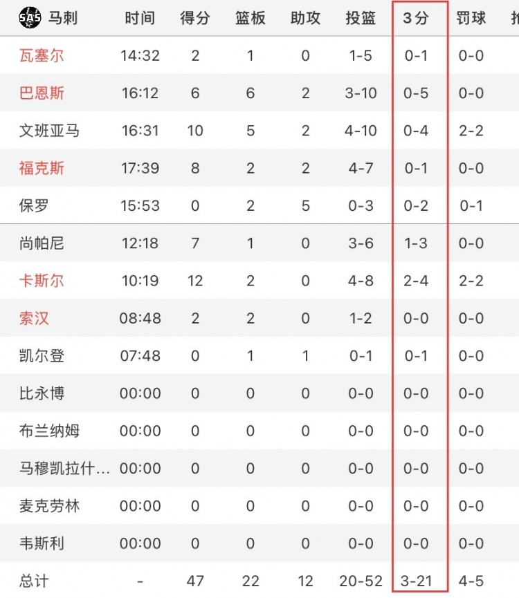 上半场比赛,马刺外线全员失准,都没有状态,全队21投仅3中,命中率仅为14.3%...