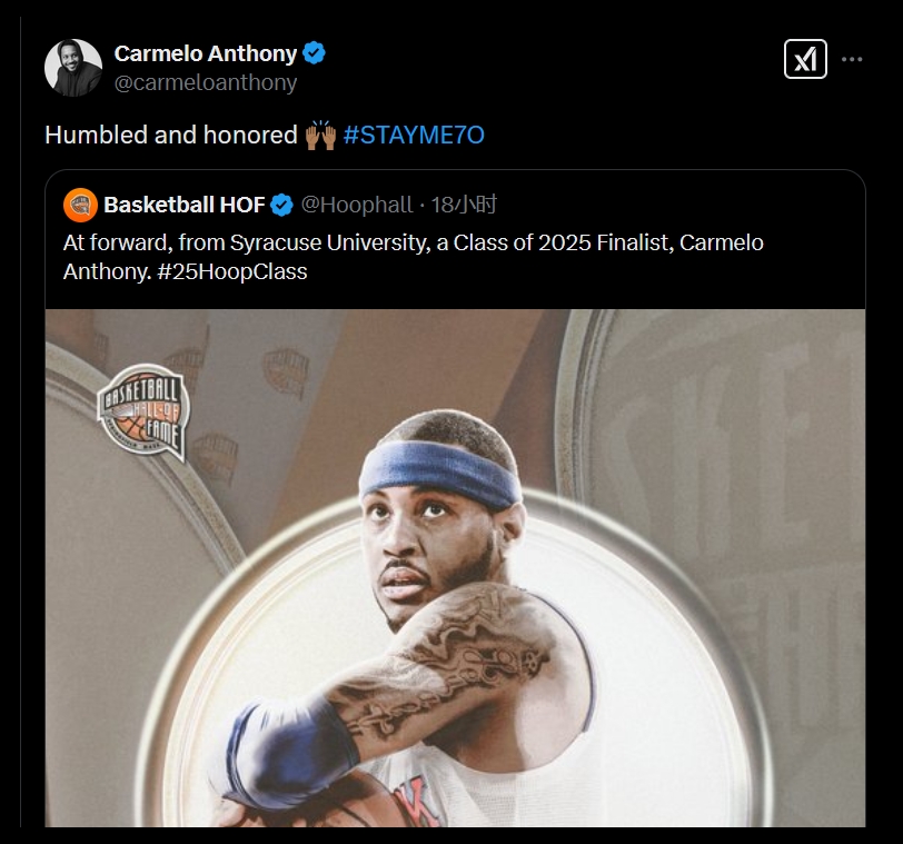 02月16日讯 安东尼更新个人社交媒体,转发了自己入选2025年名人堂最终候选名单的新闻。