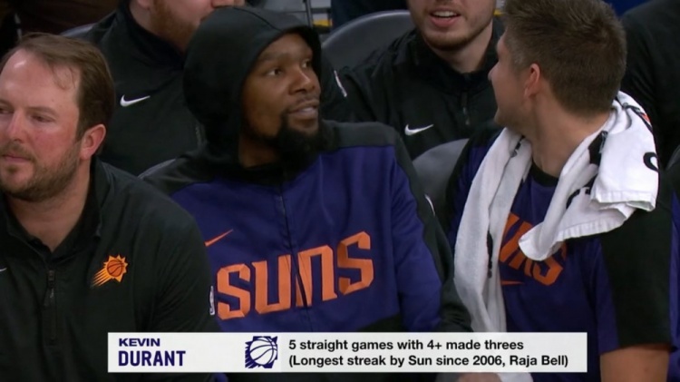 杜兰特连续5场轰进4+三分 太阳队史自2006年拉加-贝尔后首人 2月1日讯 NBA常规赛,太阳客场130-105击败勇士。杜兰特本场出战29分21秒,13投6中(三分9中5)、罚球4中2,拿下19分6篮板3助攻1抢断1盖帽。转播方晒出数据,这是杜兰特连续5场比赛至 2025/02/01