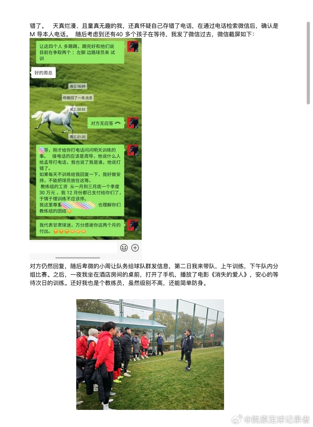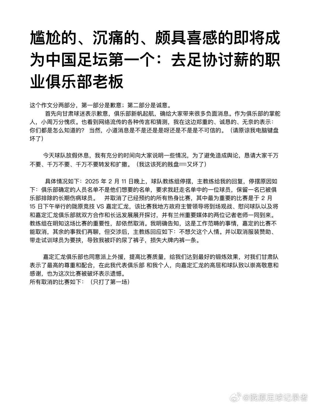 博主写道:“兰州陇原竞技足球俱乐部遭遇内部风波,教练组因投资人不同意引进一名长期处于伤病状态的球员而集体停摆失联,热身赛被取消,一季度预付的工资尚未退回。”这种狗血的事情让我们年轻的兰州球队遇到了,支持俱乐部周总维护自身和俱乐部的合法权益,抵制中国足球圈的糟烂人情世故乱象,呼吁那些不热爱中国足球的没有多少文化的酒蒙子,寄生虫们滚出足球圈!