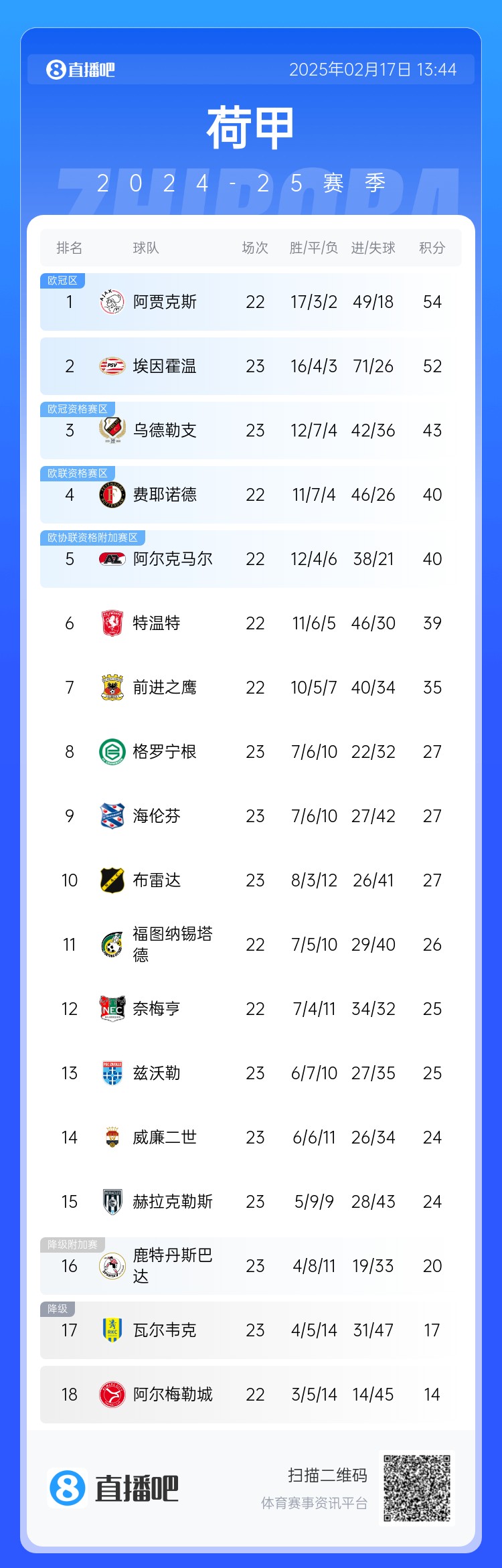 杀疯了!贾府7连胜少赛一场2分领跑荷甲,埃因霍温狂轰31脚憾平