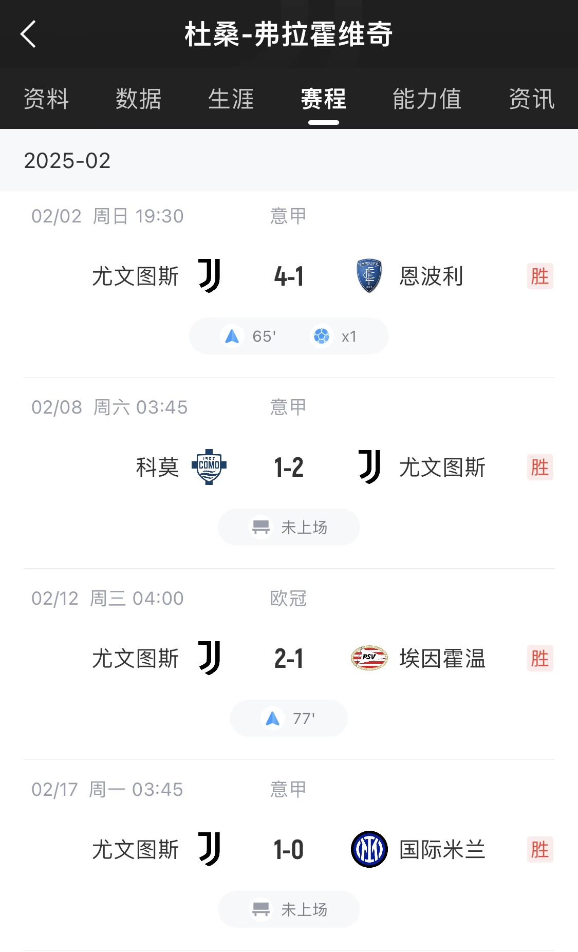 2月份至今尤文的4场比赛,弗拉霍维奇2场未登场,2场替补,打入1球。
