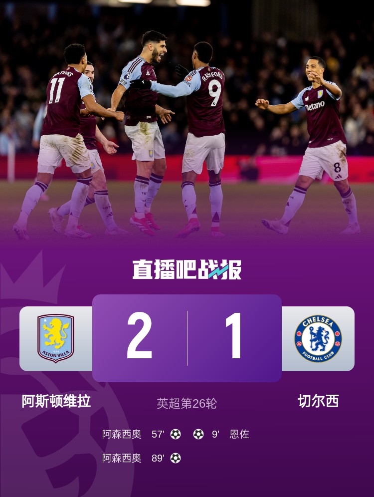 英超联赛第26轮,切尔西客场1-2遭遇阿斯顿维拉逆转绝杀,阿森西奥梅开二度,拉什福德2次助攻。