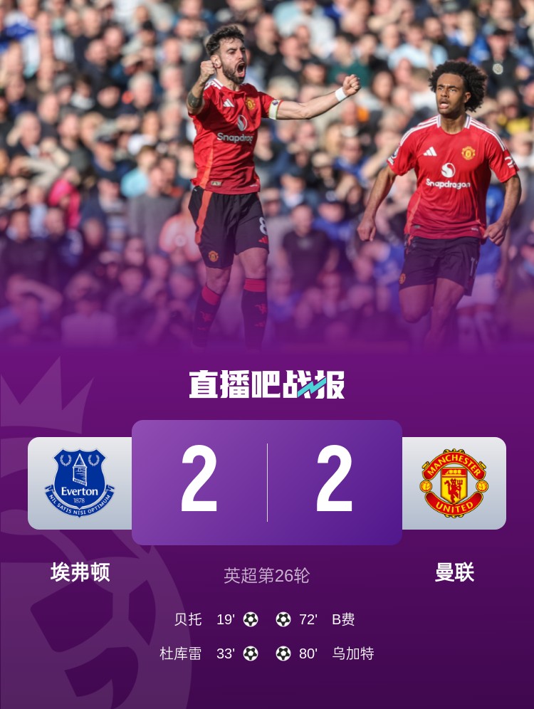 英超联赛第26轮,曼联2-2战平埃弗顿,B费、乌加特进球。