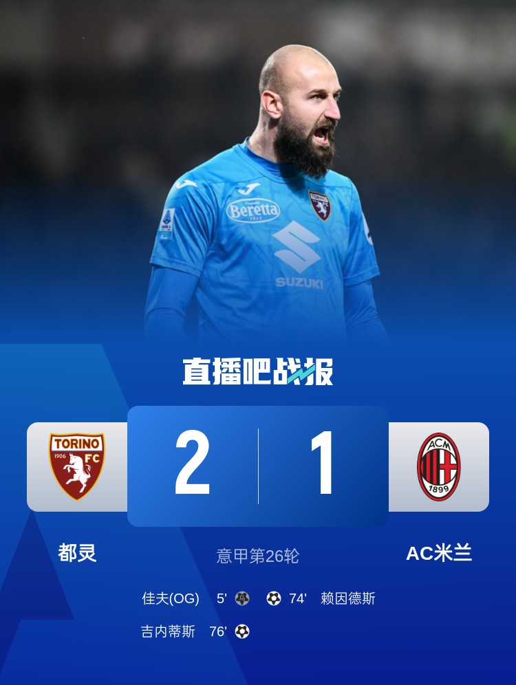 意甲第26轮,AC米兰客场1-2不敌都灵,佳夫乌龙球,都灵门将瓦尼亚发挥出色。