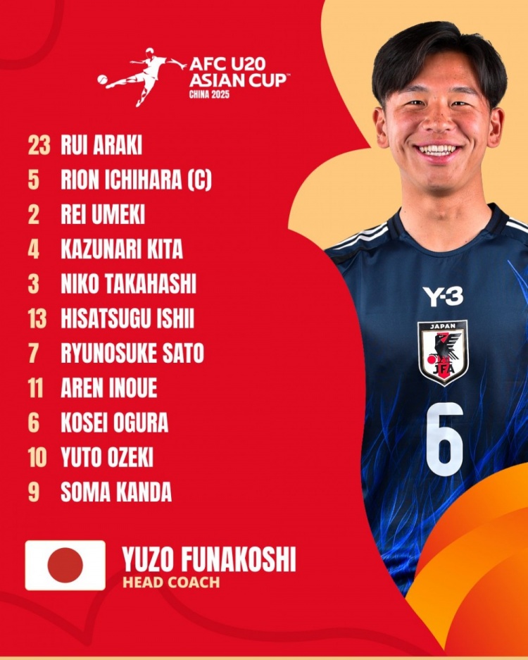 日本U20首发:23-荒木琉伟、3-高桥仁胡、5-市原吏音、4-喜多壱也、2-梅木怜、13-石井久继、7-佐藤龙之介、10-大关友翔、6-小仓幸成、11-井上爱簾、9-神田奏真