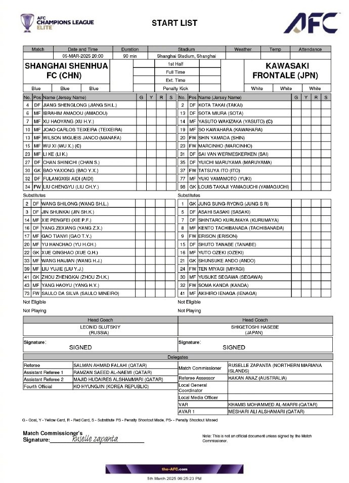 2024/25亚冠精英联赛1/8决赛首回合 上海申花vs川崎前锋 首发名单