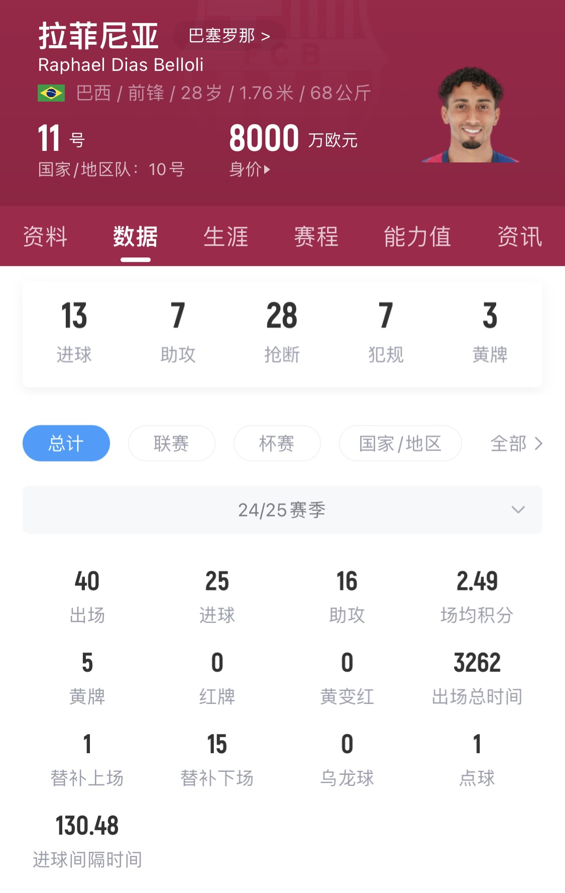 28岁的巴西前锋目前身价8000万欧,本赛季至今40场比赛25球16助。