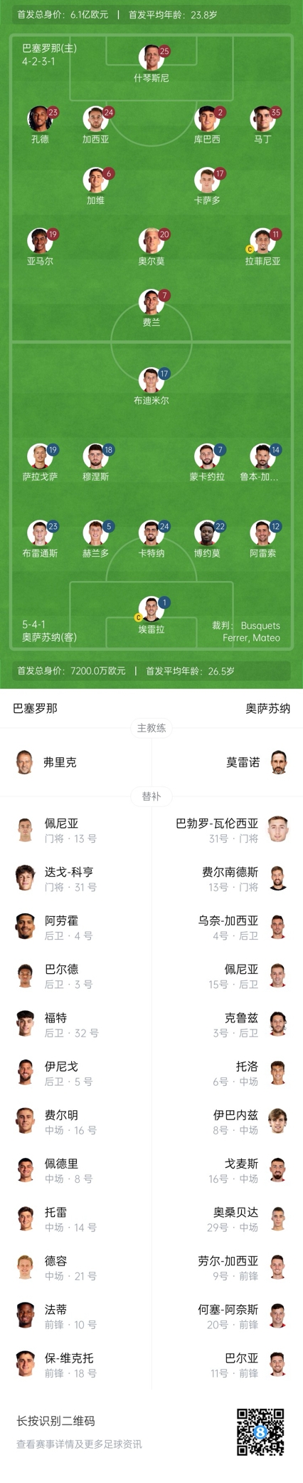 巴萨替补:13-佩尼亚、31-科亨、3-巴尔德、4-阿劳霍、5-伊尼戈-马丁内斯、8-佩德里、10-法蒂、14-巴勃罗-托雷、16-费尔明、18-保-维克托、21-德容、32-福特