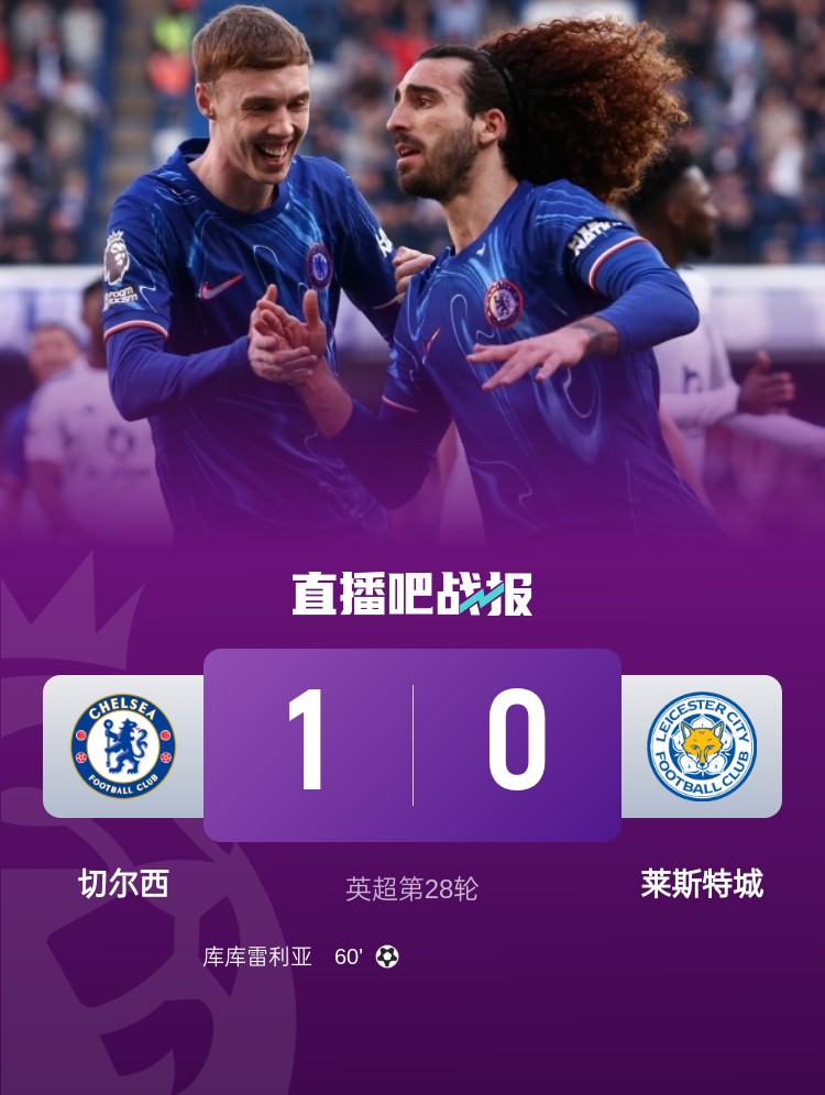 切尔西1-0击败莱斯特城,库库雷利亚打入全场唯一进球。