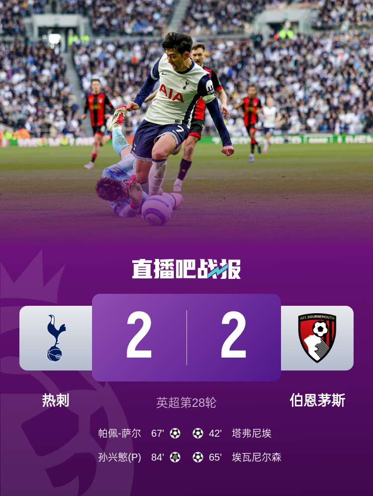 热刺2-2战平伯恩茅斯,萨尔、孙兴慜破门,热刺未能主场全取3分。