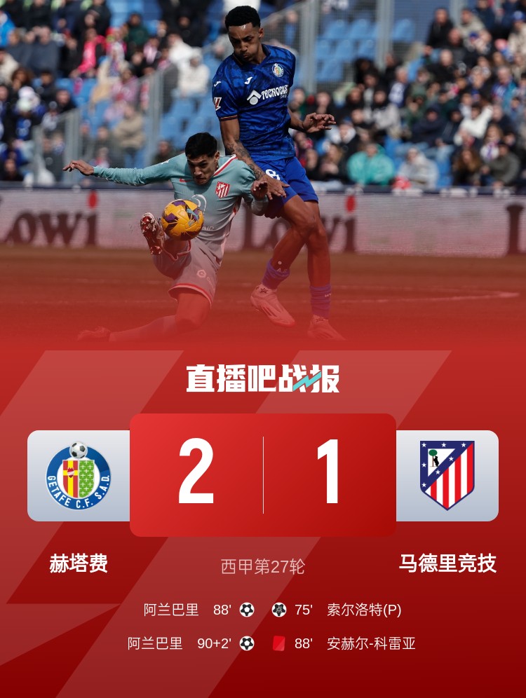 马竞1-2不敌赫塔费,科雷亚第88分钟染红,马竞错失登顶机会!