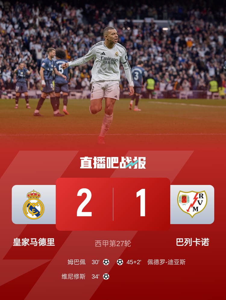 皇马本轮2-1击败巴列卡诺,姆巴佩、维尼修斯破门,皇马多赛平榜首!