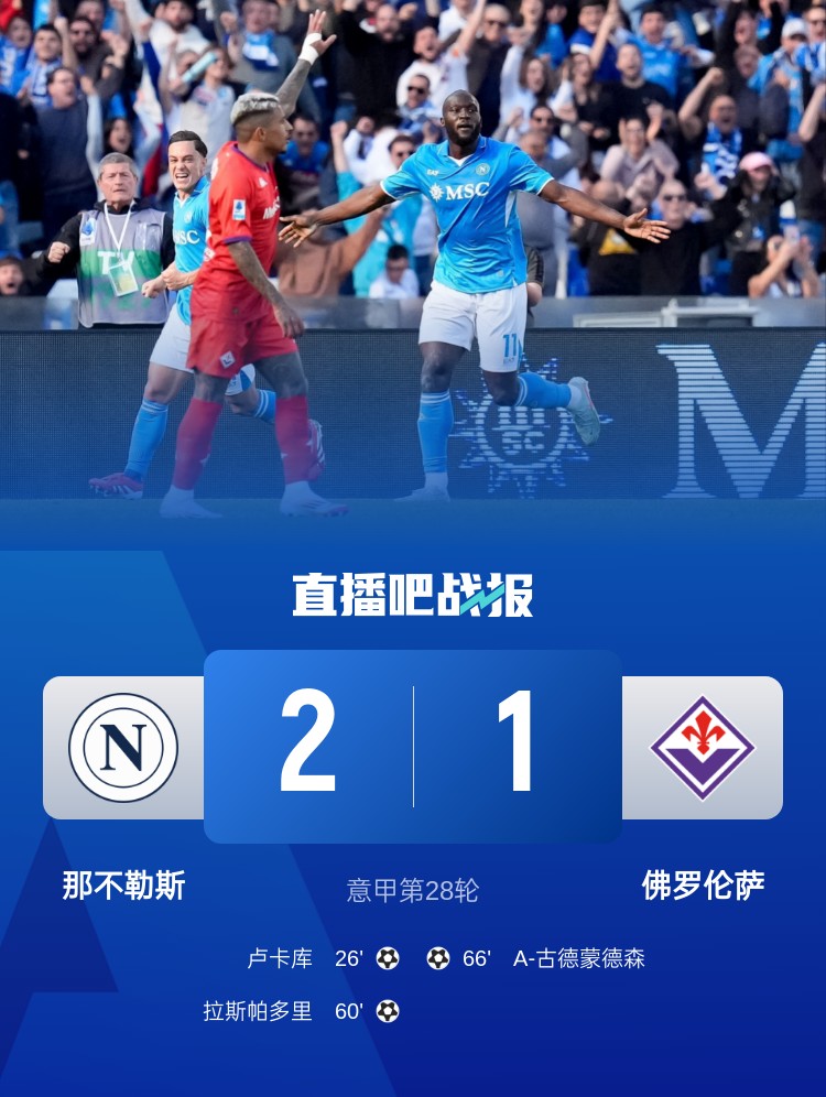 那不勒斯2-1击败佛罗伦萨,取得近6轮首胜,卢卡库、拉斯帕多里破门。