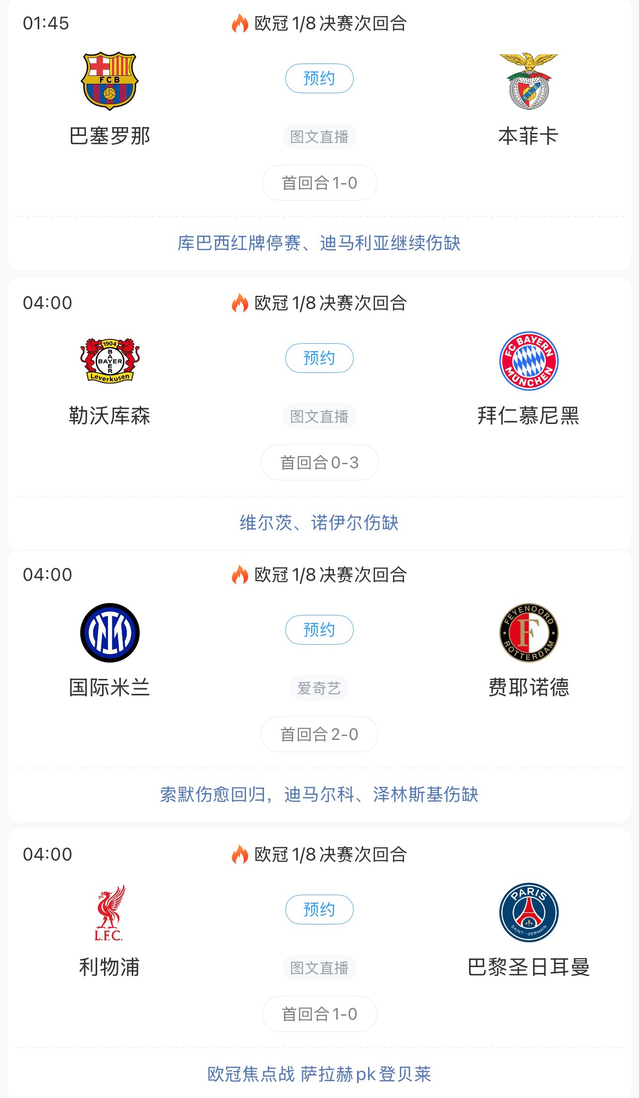 北京时间明天凌晨,欧冠1/8决赛次回合开打,利物浦大战巴黎,萨拉赫与登贝莱继续“金球之争”,拜仁与勒沃库森上演德甲内战,巴萨、国米出战。四组对阵中会不会出现逆转?今晚拭目以待!