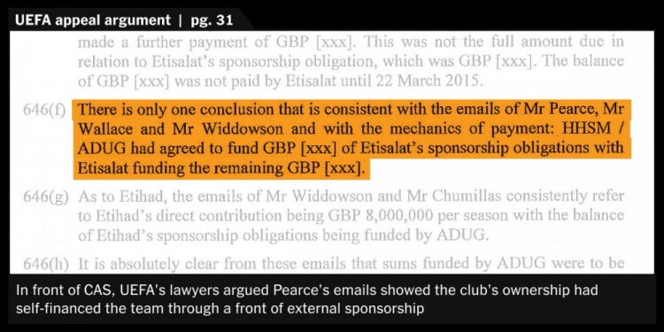 欧足联表示,西蒙-皮尔斯的邮件中表明,为规避关联交易规则,进行了一些财务操作。西蒙-皮尔斯是曼城董事会成员,也是穆巴拉克的特别顾问。邮件中还引入了一个叫做“穆罕默德”的代称。