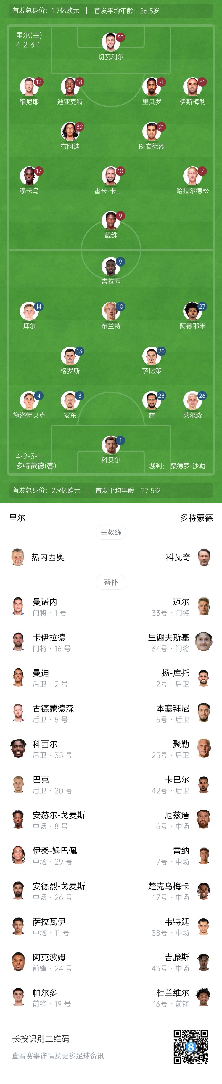 多特vs里尔首发:吉拉西、阿德耶米、布兰特先发,拜尔出战