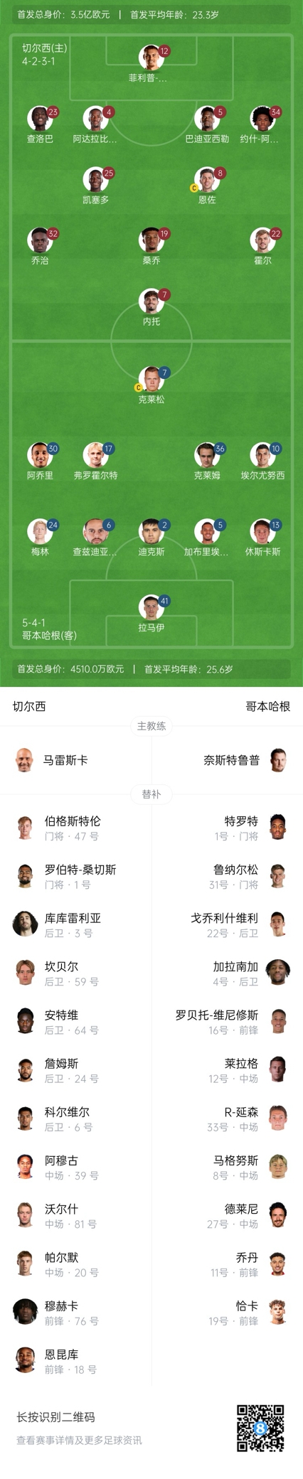 切尔西首发:12-约根森、34-阿奇姆彭、23-查洛巴、4-阿达拉比奥尤、5-巴迪亚西勒、25-凯塞多、8-恩佐-费尔南德斯、32-乔治、22-霍尔、19-桑乔、7-内托