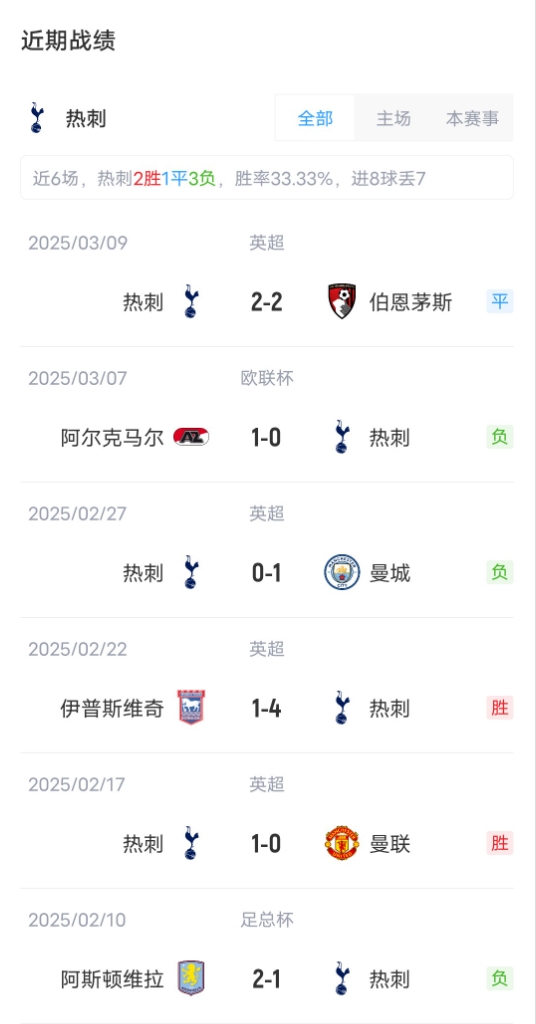 ▶️2025年03月13日 皇马总比分2-2点球4-2淘汰马竞 8强将战阿森纳 小蜘蛛点球违例 ▶️2025年03月13日 战巴黎!维拉3-0总比分6-1布鲁日进8强 阿森西奥双响拉什福德助攻 ▶️2025年03月13日 挺进8强!阿森纳2-2总比分9-3埃因霍温 四分之一决赛将战皇马 ▶️2025年03月13日 将战巴萨!多特2-1总比分3-2逆转里尔 埃姆雷-詹点射拜尔建功 ▶️2025年03月13日 无缘逆转!广岛三箭总比分1-4狮城水手遭淘汰 首回合6-1被判0-3! ▶️2025年03月12日 韩国独苗!光州3-2翻盘神户进八强 阿萨尼85分钟绝平118分钟绝杀 ▶️2025年03月12日 止步16强!申花0-4惨败川崎总比分1-4遭淘汰 鲍亚雄失近角+遭戏耍 ▶️2025年03月12日 亚冠-马赫雷斯梅开二度 吉达国民2-0赖扬两回合5-1晋级 ▶️2025年03月12日 亚冠-新月4-0总比分4-1塔什干棉农进八强 马尔科姆破门多萨里点射 ▶️2025年03月12日 双杀完胜!拜仁2-0总比分5-0勒沃库森晋级欧冠8强 凯恩传射建功 ▶️2025年03月12日 无缘8强!利物浦两回合1-1点球1-4巴黎 登贝莱破门多纳鲁马两扑点 ▶️2025年03月12日 双杀!国米2-1总比分4-1费耶诺德晋级将战拜仁 图拉姆恰20破门 ▶️2025年03月12日 双杀进8强!巴萨3-1总比分4-1本菲卡 拉菲尼亚2射1传亚马尔传射 ▶️2025年03月11日 球迷扔水瓶&绝平被吹引争议!柔佛主场0-1武里南联无缘亚冠八强 ▶️2025年03月11日 亚冠止步16强!海港1-4横滨总分1-5出局 海港中后场多人犯错溃败