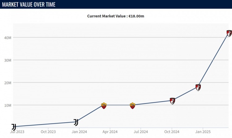 怀森是在去年夏天由尤文图斯加盟伯恩茅斯,来到英超以后身价开始逐步攀升,由去年10月份的1200万欧先是涨至1800万欧,目前达到4200万欧。