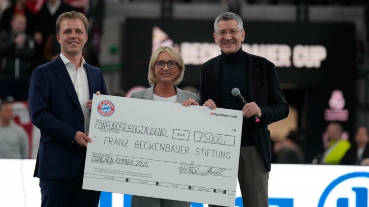 此外,本届赛事总计获得了7.5万欧元的收益,这笔收入捐献给弗朗茨-贝肯鲍尔基金会,拜仁主席海纳作为代表将支票交给贝皇的家人海蒂-贝肯鲍尔和约尔-贝肯鲍尔。