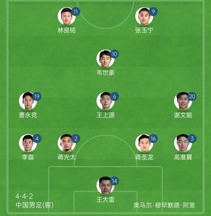 国足官方阵型442菱形中场:王上源单后腰,张玉宁、林良铭双前锋