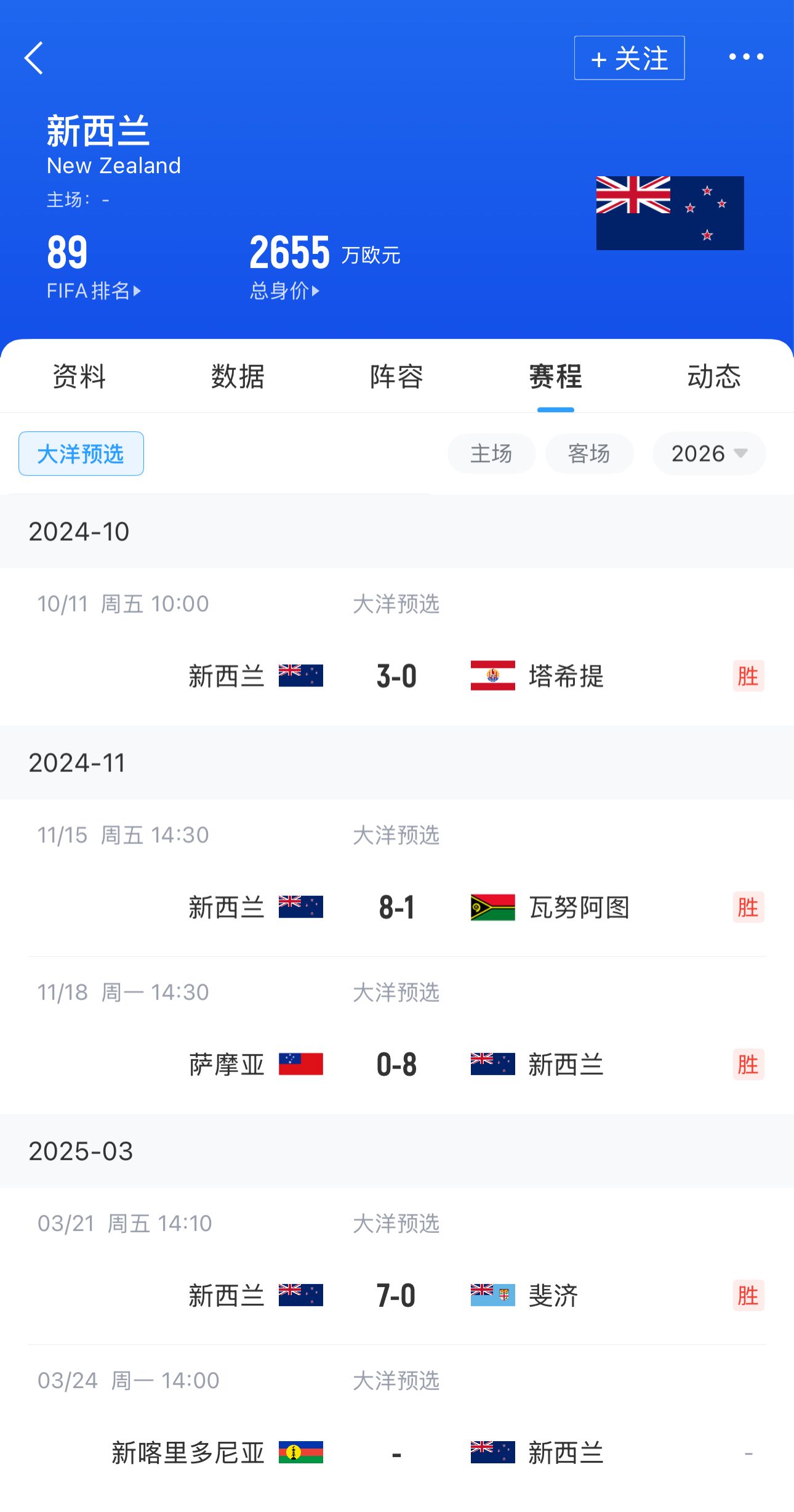 新西兰FIFA排名第89,只比国足高1位,阵容身价2655万欧,本届预选赛至今4场打进26球只丢1球。