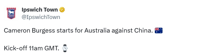 伊普斯维奇社媒:卡梅伦·伯吉斯首发代表澳大利亚队对阵中国队。格林威治时间上午11点开球。