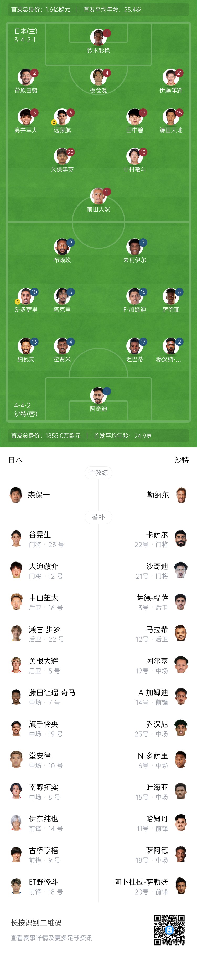 日本首发:1-铃木彩艳、3-高井幸大、4-板仓晃、21-伊藤洋辉、2-菅原由势、13-中村敬斗、6-远藤航、17-田中碧、15-镰田大地、20-久保建英、11-前田大然