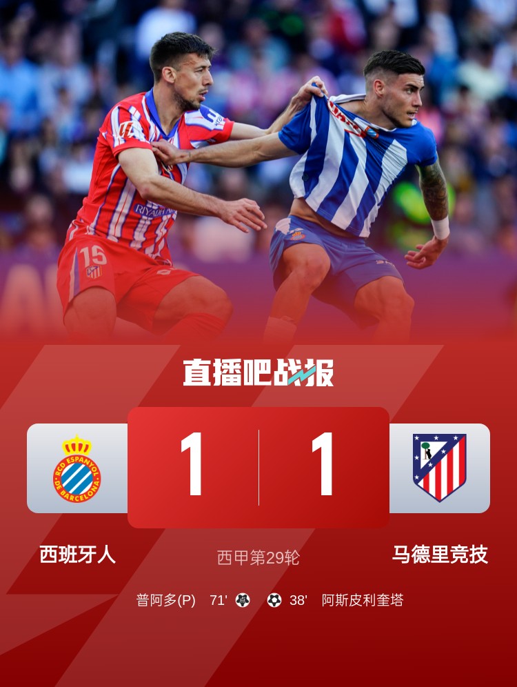 西甲第29轮,马竞客场1-1西班牙人。上半场,勒诺尔芒伤退,阿斯皮利奎塔凌空无解世界波;下半场,朗格莱鲁莽拉人送点,普阿多点射扳平。