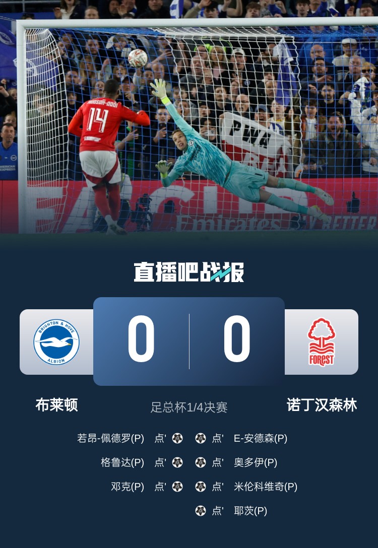 足总杯-布莱顿点球大战3-4诺丁汉森林遭淘汰 塞尔斯两扑点
