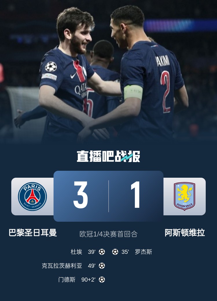 欧冠8强首回合,巴黎3-1击败维拉,杜埃破门,克瓦拉茨赫利亚精彩一条龙,门德斯补时再入一球。