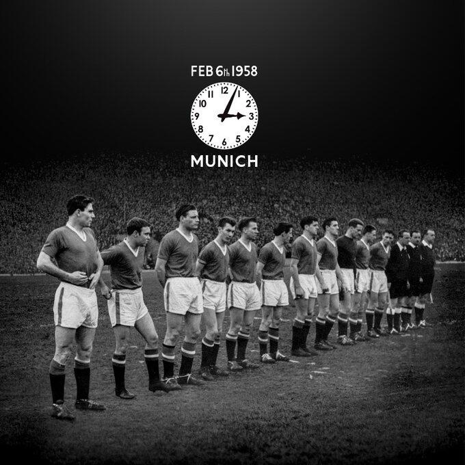 1958年2月6日,载着曼联队员和球迷以及随队记者的飞机在西德慕尼黑机场覆有积雪的跑道上第三次尝试起飞时失败坠毁,机上当时44名乘客以及机组人员中的23人不幸遇难,遇难者包括8名曼联球员以及3名俱乐部的职员。