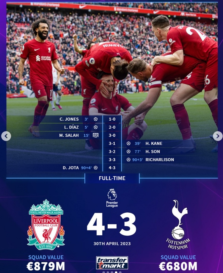 2023年4月,英超:利物浦4-3热刺。琼斯、路易斯-迪亚斯、萨拉赫上半场连入三球,凯恩、孙兴慜连扳两球,理查利森第93分钟“绝平”,若塔第94分钟绝杀。