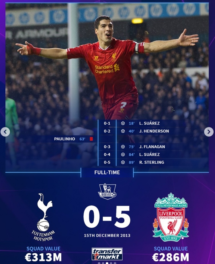 2013年12月,英超:热刺0-5利物浦。苏亚雷斯贡献2球2助攻,并制造保利尼奥染红,亨德森传射建功,红军客场取得大胜。